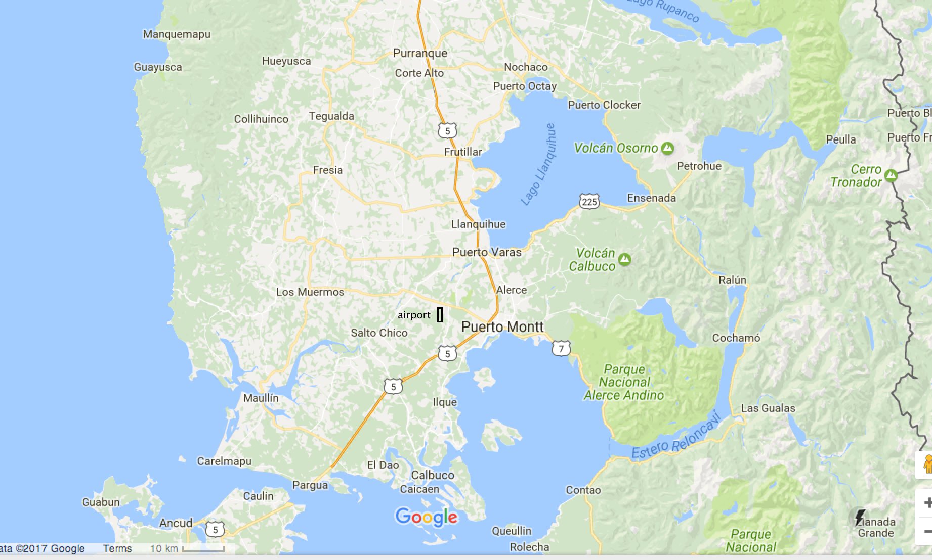 Por tierra son aproximadamente 1.000 km desde Santiago o 2.300 km desde Punta Arenas. Desde Punta Arenas al norte el viaje se realiza por el lado argentino y se cruza a Chile por el Paso Monte Aymond cercano a la ciudad Argentina de RÃo Gallegos y a 192 km de Punta Arenas. Hay buses regulares desde Santiago todos los dias, con una duración de 12 horas, generalmente la salida de los buses es en la noche para llegar temprano por la mañana a Puerto Varas.